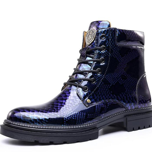 Men's Python-Print Patent Leather Ankle Boots With Lace-Up Design